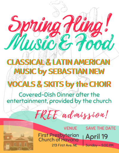 The First Presbyterian Church of Havana at 213 First Ave. NE is having it’s Spring Fling with live music and skits April 19th at 5:00pm – Enjoy a covered dish dinner after the entertainment.